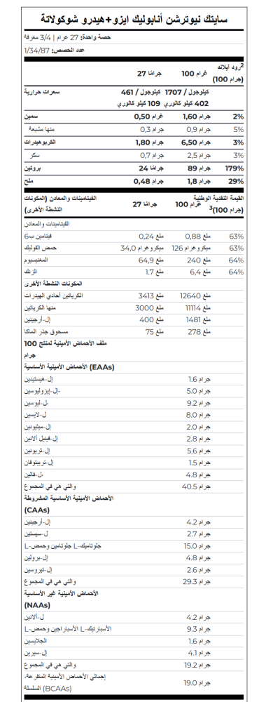 لا يُغني هذا المنتج عن نظام غذائي متنوع ومتوازن ونمط حياة صحي. لا يُنصح به لمن هم دون سن 18 عامًا أو لمن يعانون من حالات طبية. لا يُستخدم أثناء الحمل أو الرضاعة. لا يُنصح به لمن يعانون من حالات طبية أو يتناولون أدوية