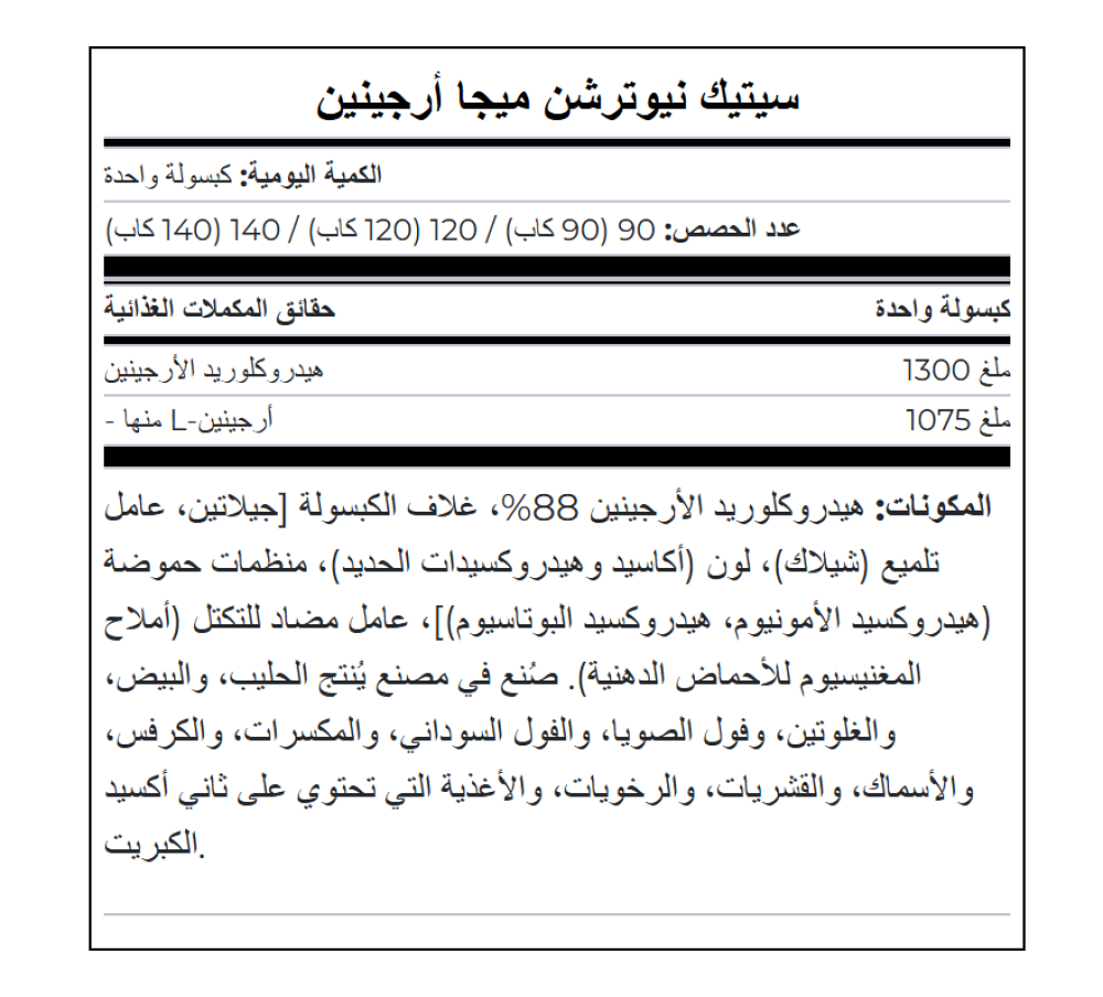 - 1300 ملغ من هيدروكلوريد الأرجينين في كبسولة واحدة كبيرة