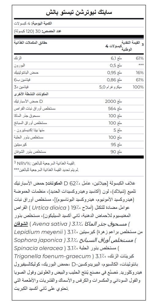 كما تحتوي على مستخلص بذور الحلبة، ومستخلص أوراق القراص، ومستخلص بذور الشوفان، والكيرسيتين، وبيتا إكديستيرون من مستخلص أوراق السبانخ.